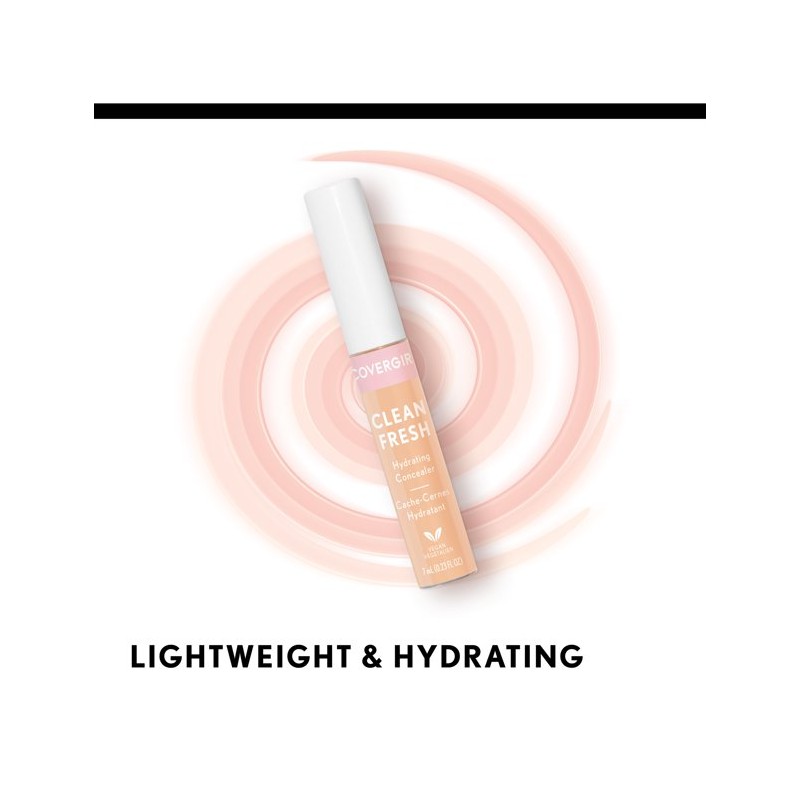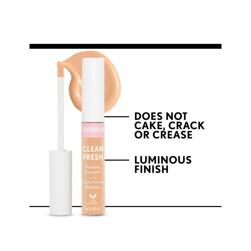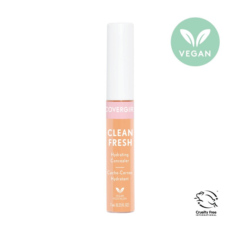 Covergirl Clean Fresh Hydrating Concealer é infundido com leite de coco e extratos de aloe para cobertura edificável e pele brilhante. A Clean Vegan Formula é feita sem ftalatos, óleo mineral, formaldeído, talco, parabenos ou sulfatos. Este corretivo líquido não endurece, racha ou dobra.
