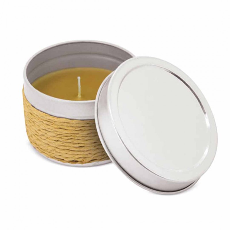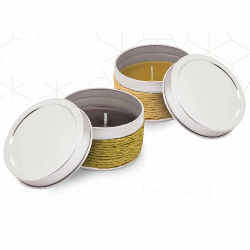 vela aromática inspirada na natureza, apresentadas numa lata metálica decorada com fio de jute acorde.