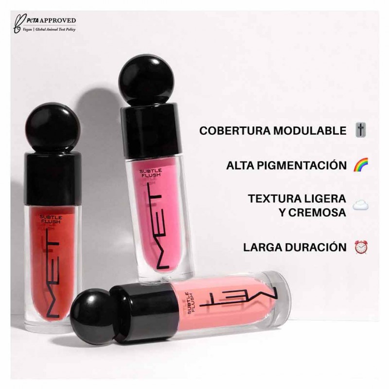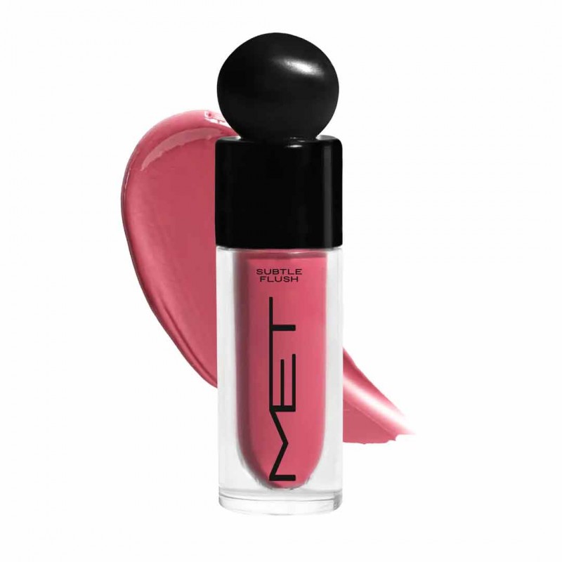 SUBTLE FLUSH da MET é um blush líquido de fórmula leve e duradoura que se espalha e fixa de forma uniforme, proporcionando um toque de cor subtil e natural nas maçãs do rosto. Aplica uma pequena quantidade em cada bochecha, pois tem alta pigmentação.